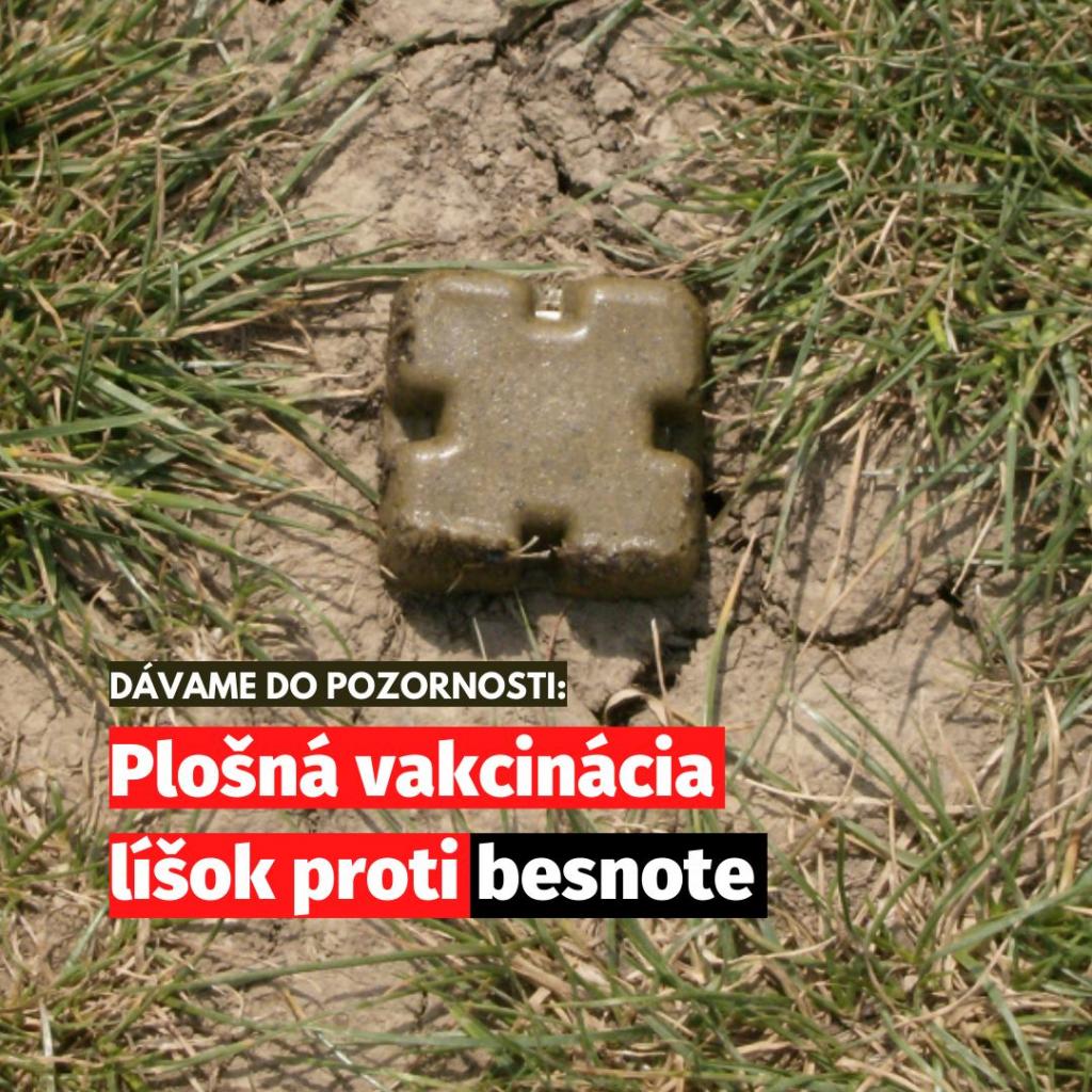 V dňoch od 7. októbra do 27. októbra 2024 bude prebiehať päťdesiata kampaň orálnej vakcinácie líšok proti besnote leteckou pokládkou na území Slovenskej republiky spolufinancovaná Európskou úniou. Na orálnu vakcináciu líšok proti besnote bude použitá vakcinačná návnada LYSVULPEN por. a. u. v., ktorá obsahuje modifikovaný oslabený vakcinačný kmeň besnoty SAD Bern v celkovom počte 367 796 vakcinačných návnad.