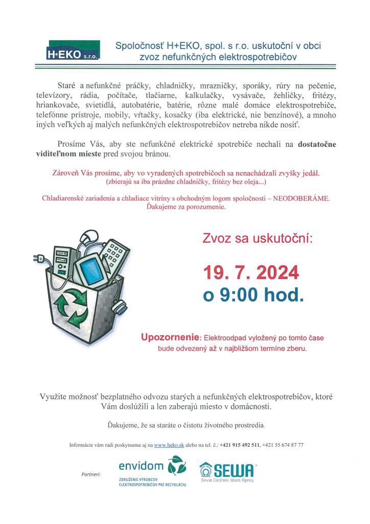 spoločnosť H+EKO uskutoční zber nefunkčného elektroodpadu v našej obci dňa 21.07.2023 (t.j. v piatok) od 09:00 hod.