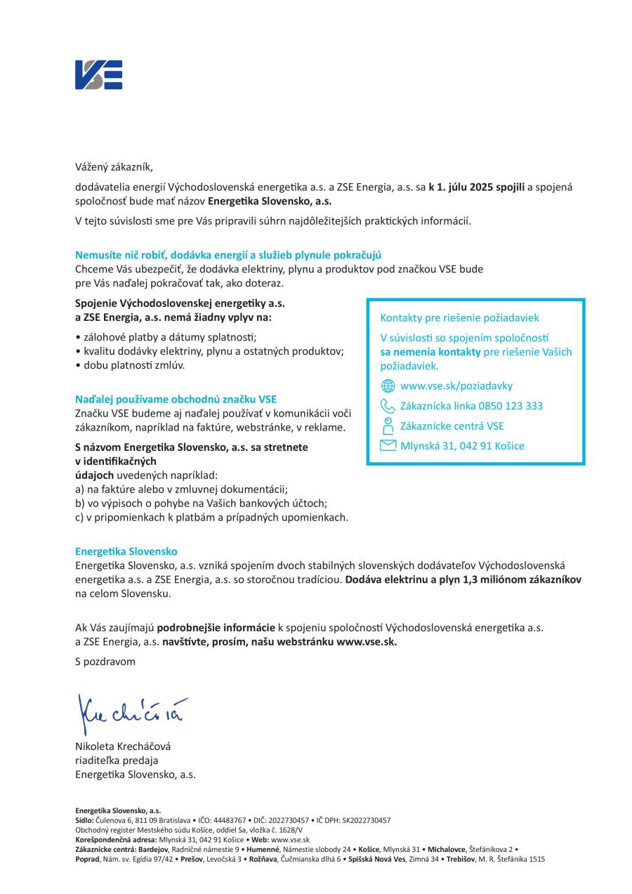 dodávatelia energií ZSE Energia, a.s. a Východoslovenská energetika a.s. sa k 1. júlu 2025 spojila a nová spoločnosť nesie názov Energetika Slovensko, a.s.